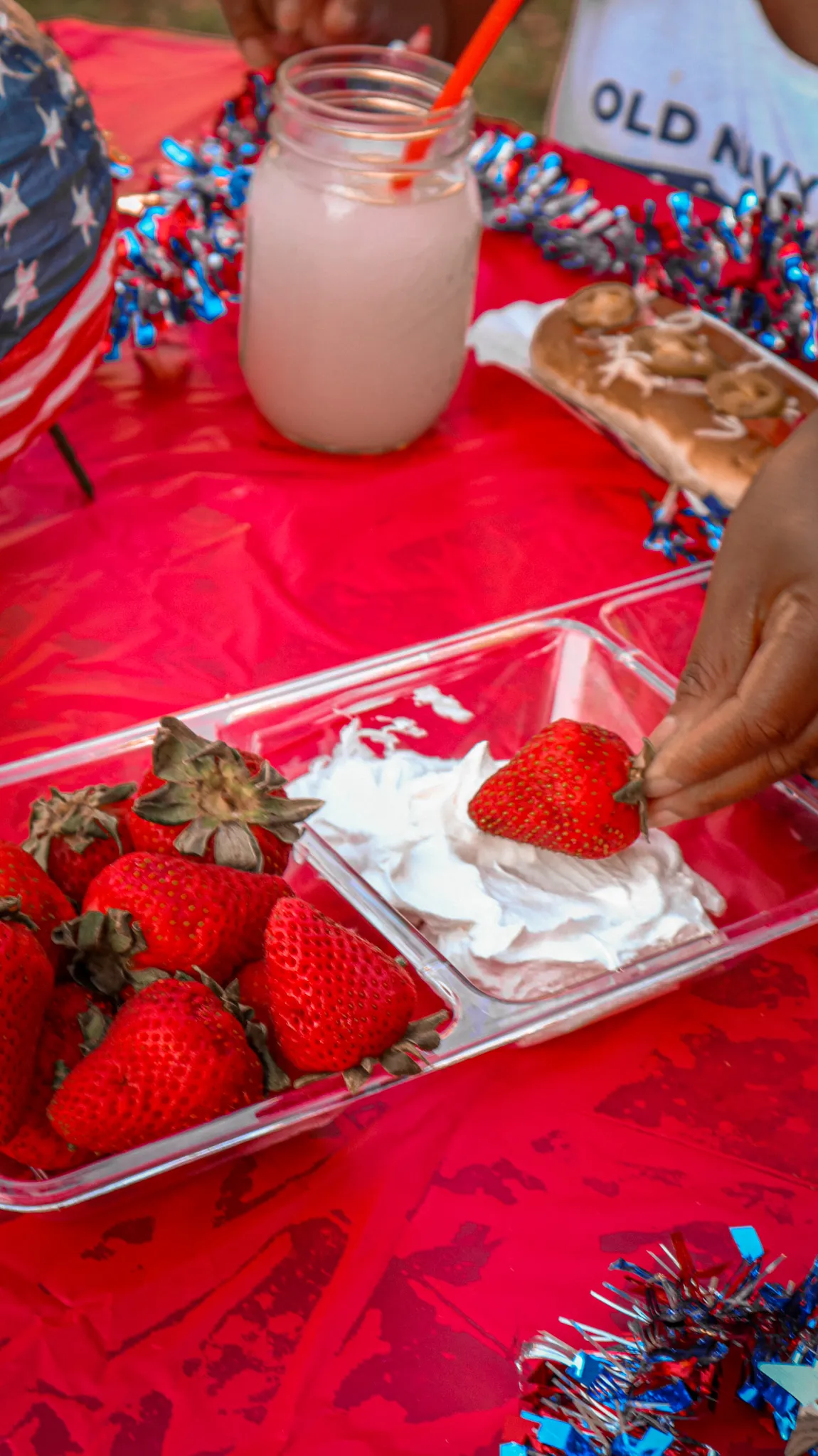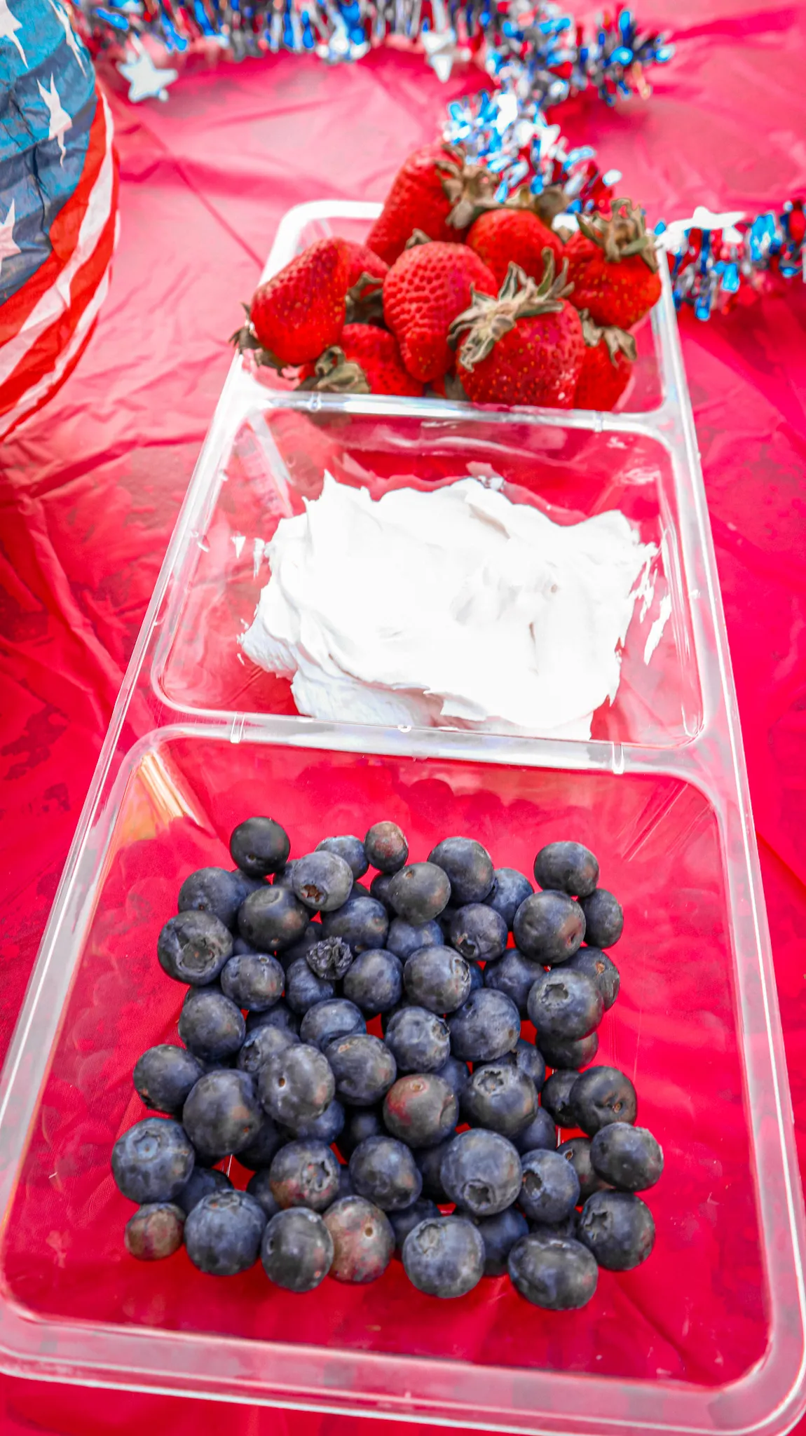 For dessert, you can make a red, white, and blue themed fruit tray! I included strawberries, blueberries, and whipped cream in mine. It is delicious and refreshing, especially during a hot day.